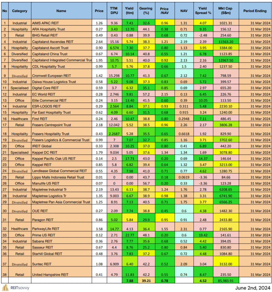 The following is the compilation of 38 Singapore REITs with colour-coding of the Distribution Yield, Gearing Ratio and Price to NAV Ratio.