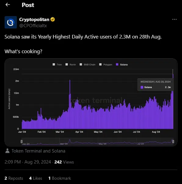 The crypto world is abuzz with news that Solana has hit a new threshold in daily active users (DAU) by the end of this month – 2.3 million people on board as of August 28.