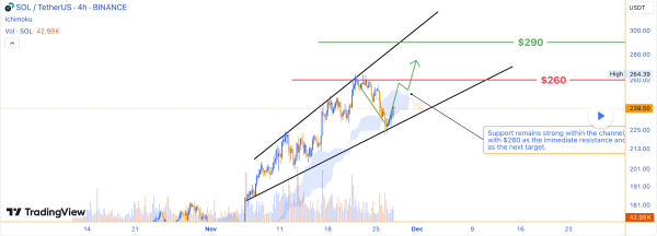 In another analysis on TradingView, Solana is seen trading within an ascending channel on the 4-hour timeframe, with a key resistance level at $260. A break above this resistance could push the price towards $290, the next significant target.