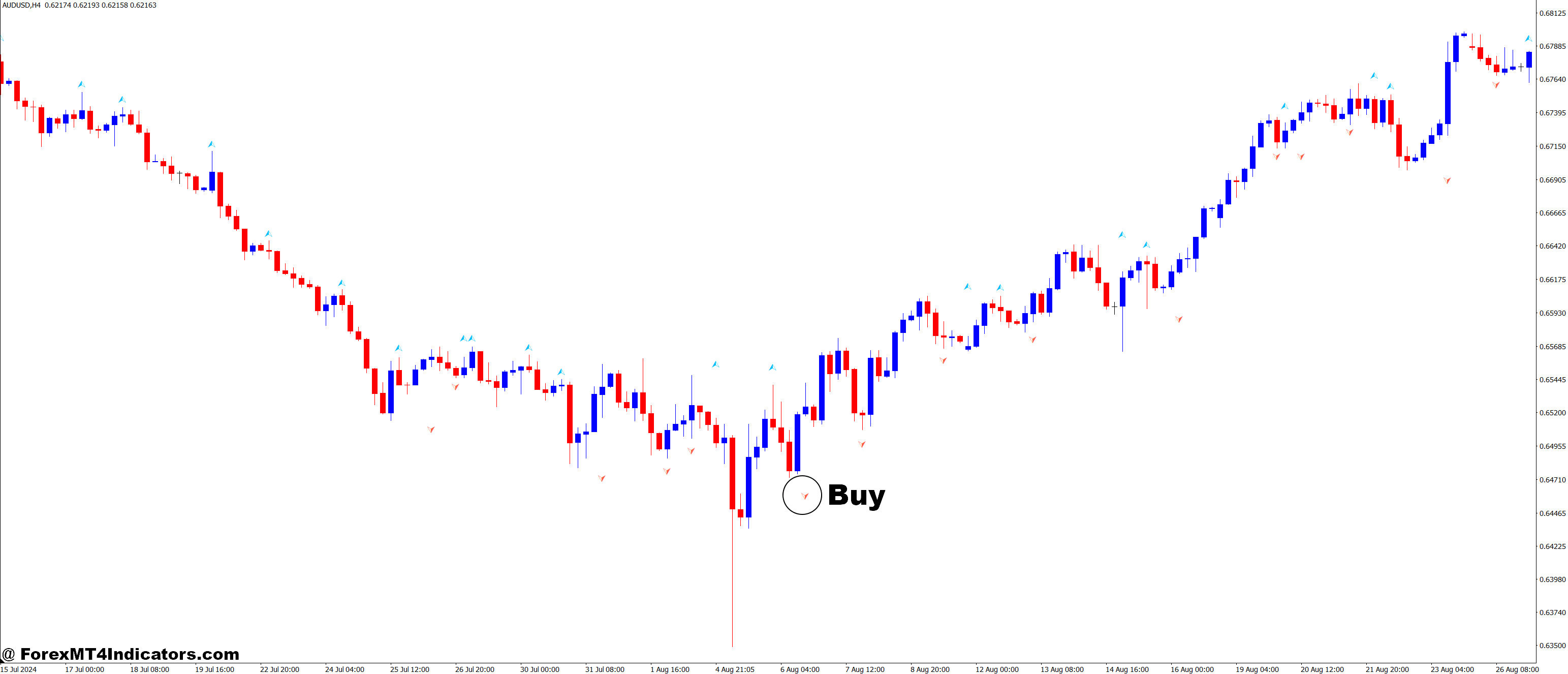 - Fractal Arrow Up: When the indicator marks a fractal pointing upward, it suggests a potential buying opportunity.