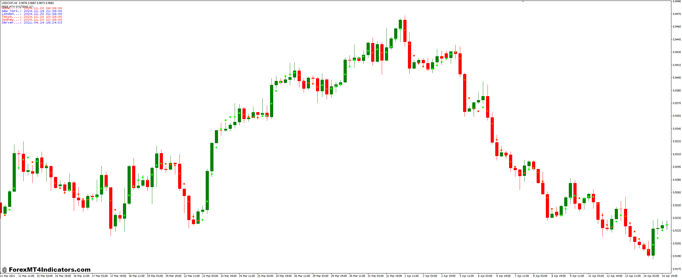 This indicator plots dots directly on the price chart, changing colors to indicate shifts in market trends. For instance, blue dots may signal bullish momentum, while red dots indicate bearish trends. These color changes allow traders to identify potential reversals and confirm existing market momentum without second-guessing the reliability of the indicator.