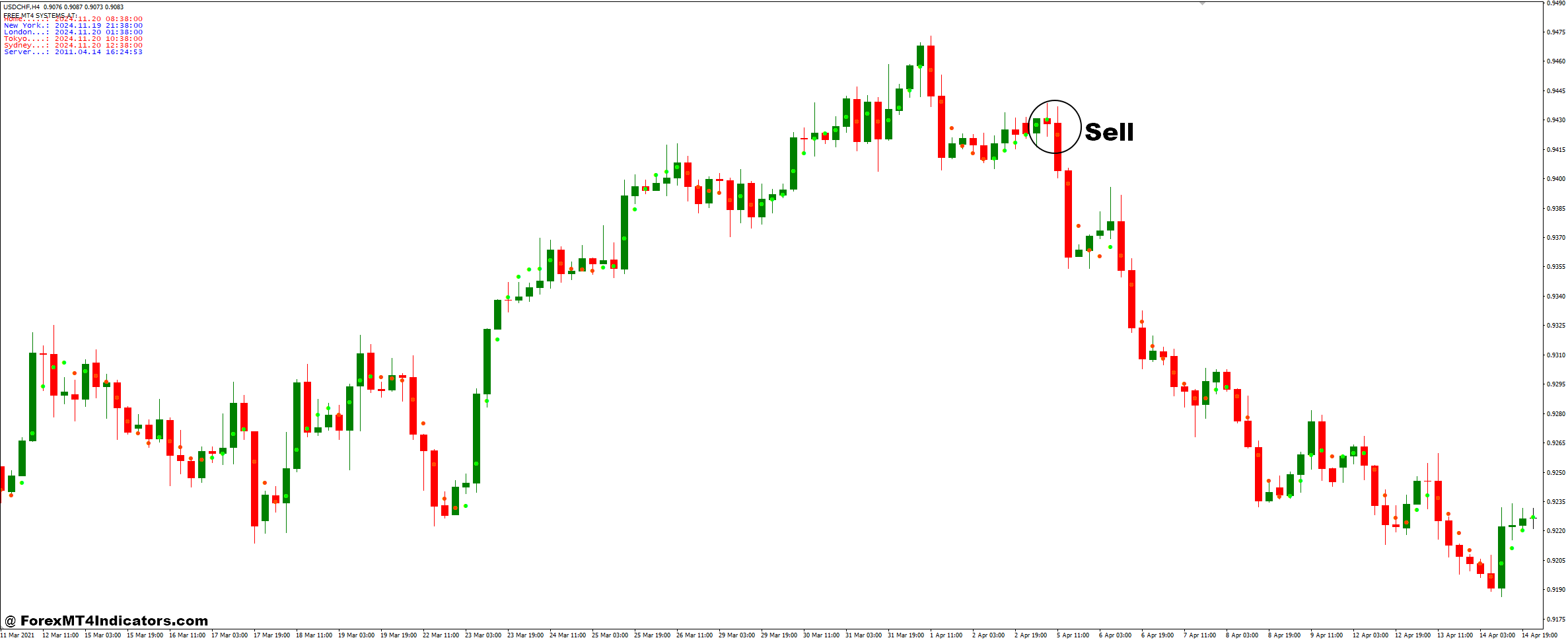 - Enter a sell trade when the Nonlagdot indicator signals align with price action and the active session.