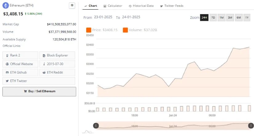 Ethereum’s price increased by more than 5% in the past 24 hours. It is now priced at $3,405.66. This rise is driven by higher adoption and interest from large institutions. The Strategic Digital Asset Stockpile reportedly holds 55,588 ETH, valued at over $184.23 million.