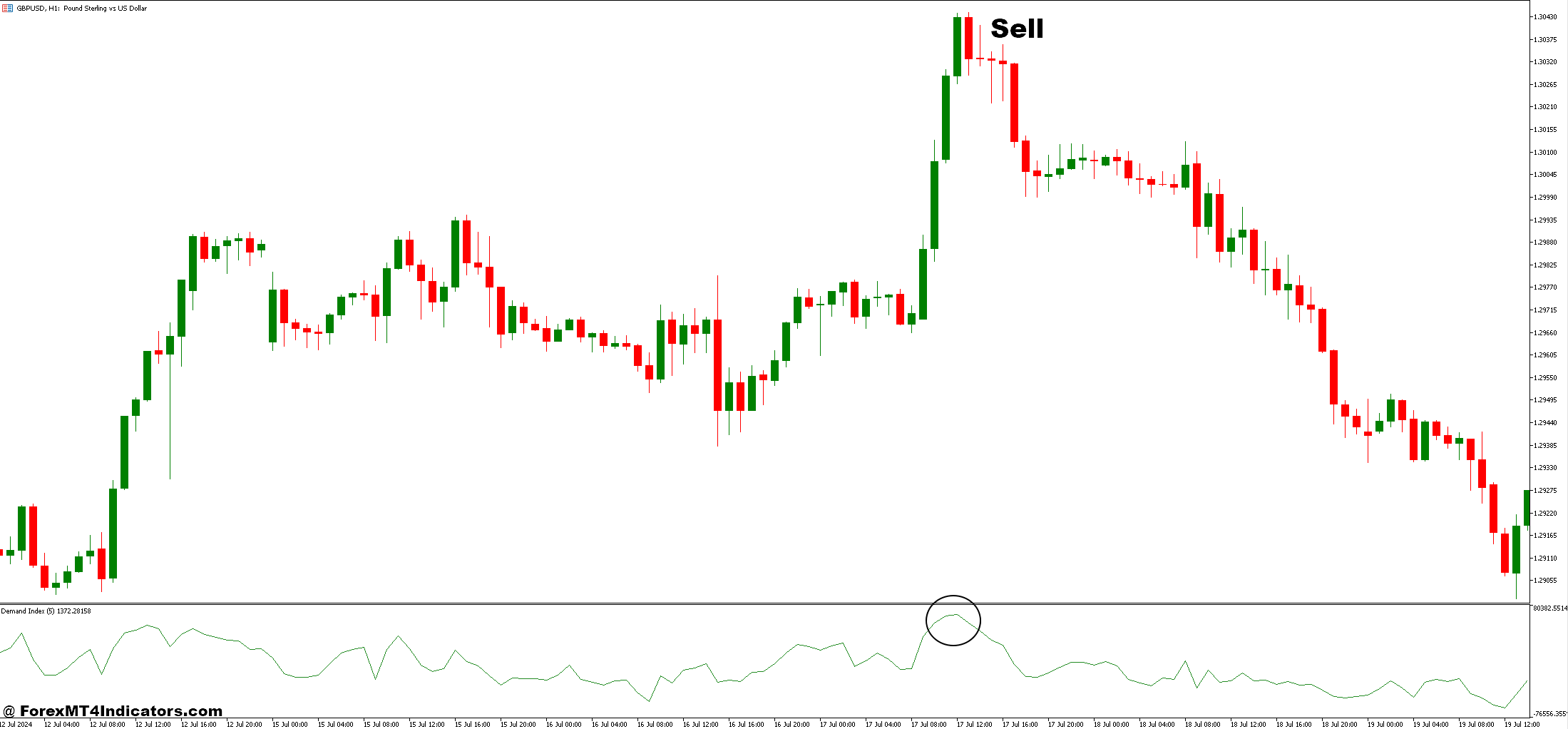 - Ensure the Demand Index is below zero, indicating strong selling pressure.