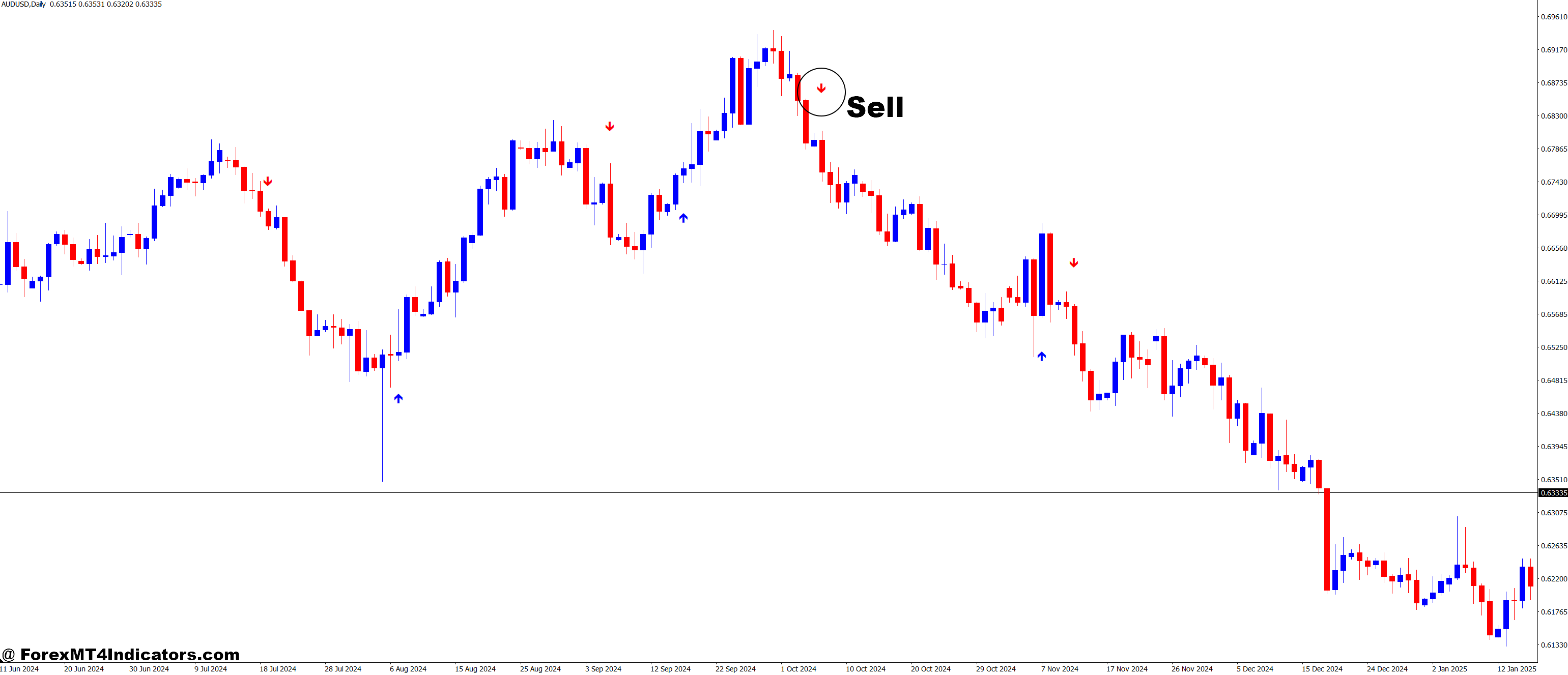 - Place a sell order when the signal appears, entering the market in the direction of the trend.