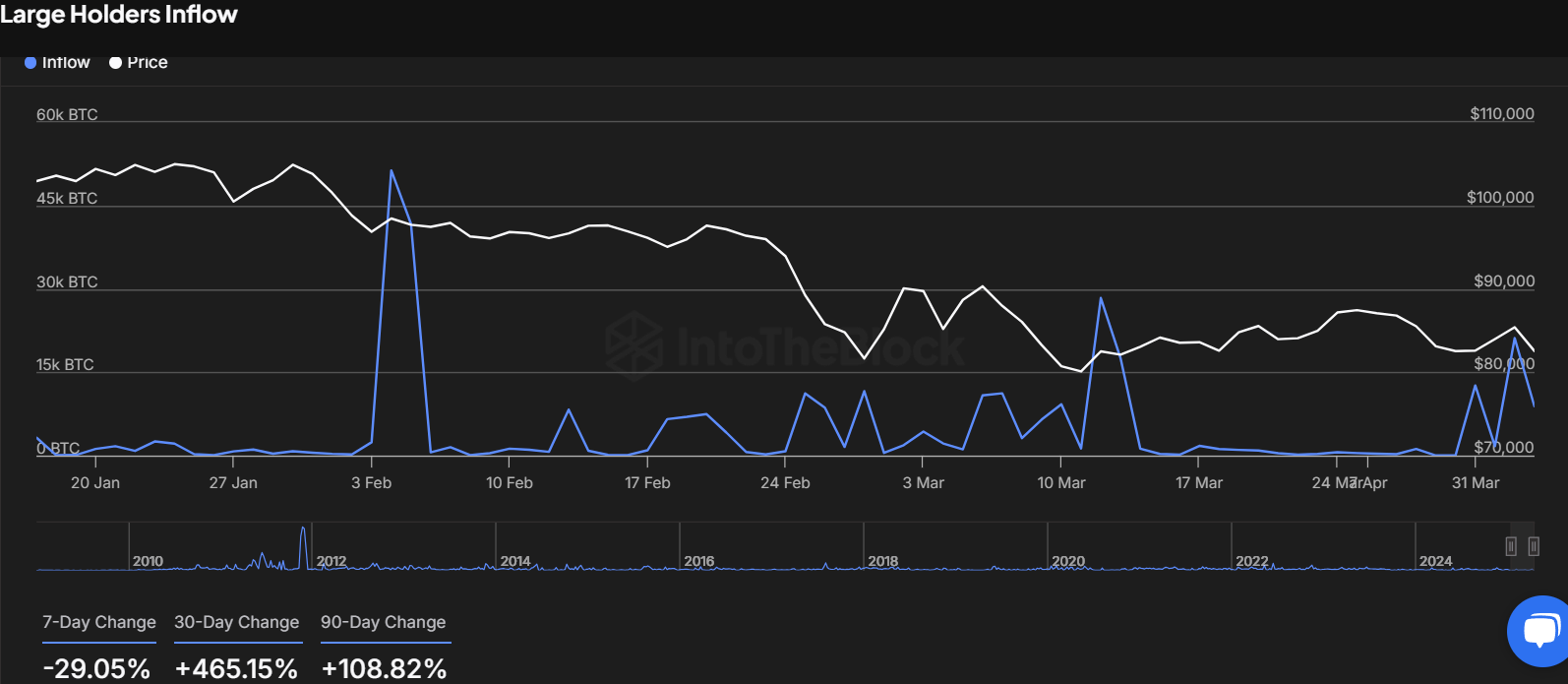 In contrast, the 30-day change shows a 465.15% increase in inflows, likely driven by a spike in early February and March. Despite this recent drop, large holders’ activity has generally risen over the past three months, according to the data.