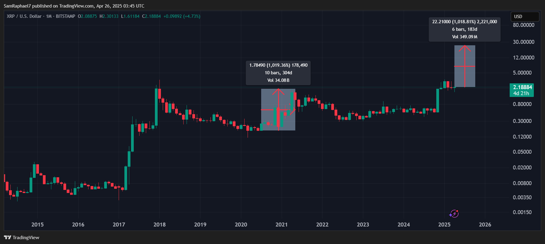 However, currently trading for $2.18, XRP is still in a position of strength for its next upsurge. Specifically, if the asset replicates the 2020/2021 cycle’s 1,000+ upsurge, such a rally would push its price to the $24 mark.