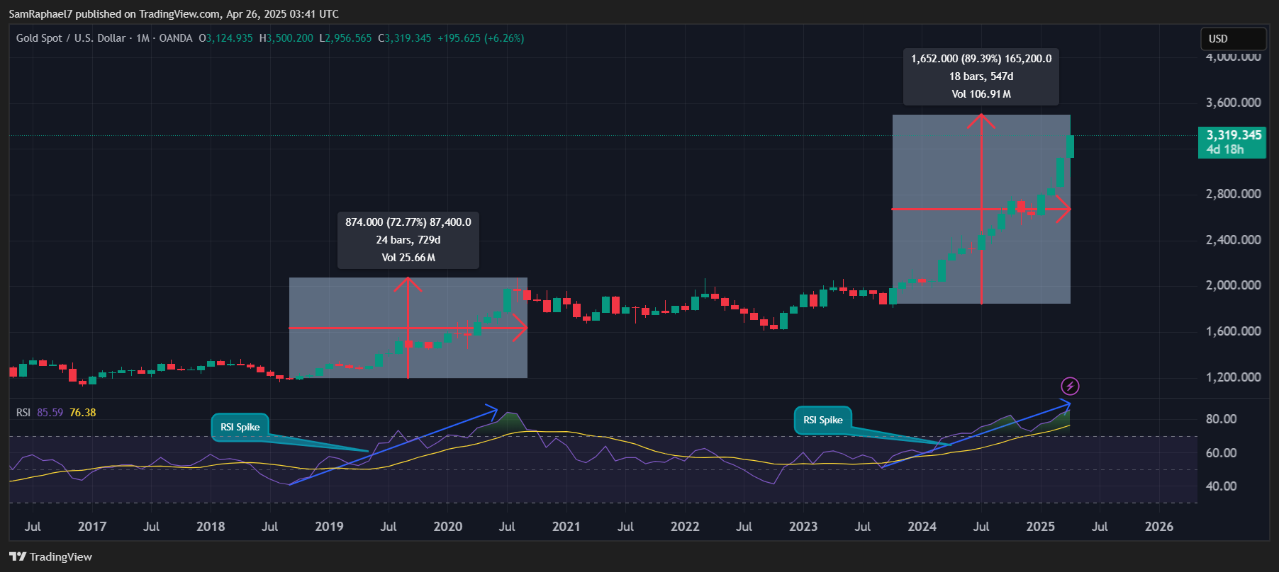 Another indicator suggesting a repetition of the previous cycle’s run is the monthly gold RSI. Notably, during gold’s uptrend from 2018 to 2020, its RSI rose from 40 to an overvalued mark of 84, indicating the uptrend would reverse. Currently, gold’s RSI has spiked from 50 to 85.