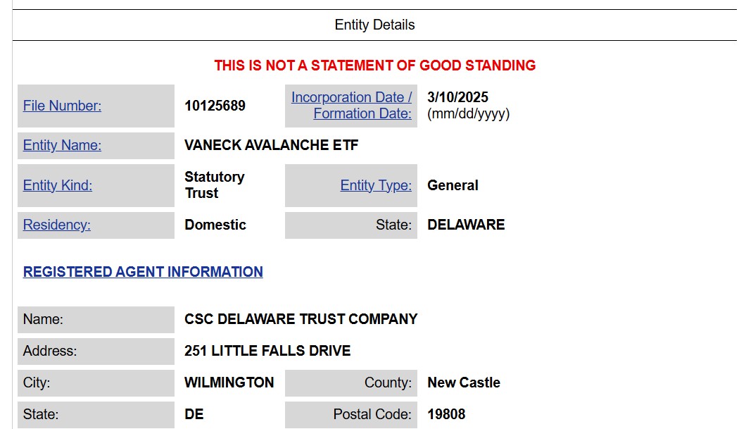 The New York-headquartered company filed the VanEck Avalanche ETF in the state of Delaware on March 10, according to the Delaware’s Department of State website.