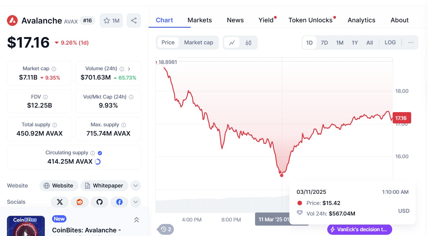 Data from CoinMarketCap shows that its year-to-date decline is at nearly 52%. Over the past 24 hours, it has dropped around 10% and is trading at $17.15. This is a slight rise from early morning trading when it was valued at just over $15.