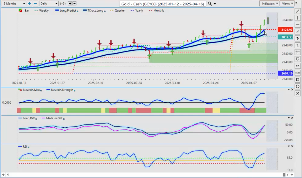 Now, with that happening, gold has spiked yet again. But let’s be clear here, guys, gold has been very bullish all year. So, for now, our yearly opening price is coming in at 2607. The monthly opening price is now the one or the quarterly; they’re both the same number for the next few months. That level is key—3123 is our main support level. Now, you can see that that’s intersecting with the Vantage Point Long Predicted, that medium-term predicted moving average. And then, my secondary one is below that, along with the weekly opening price from this previous week at 3037. So the indicators in VP are looking pretty good. The Neural Index Strength, for day traders, this is one of the most powerful tools I’ve seen in years, because we have our neural index, which is red, green, or yellow, like a stop sign, excuse me, but it also has the neural index strength, which tells us the underlying strength of that particular asset class.