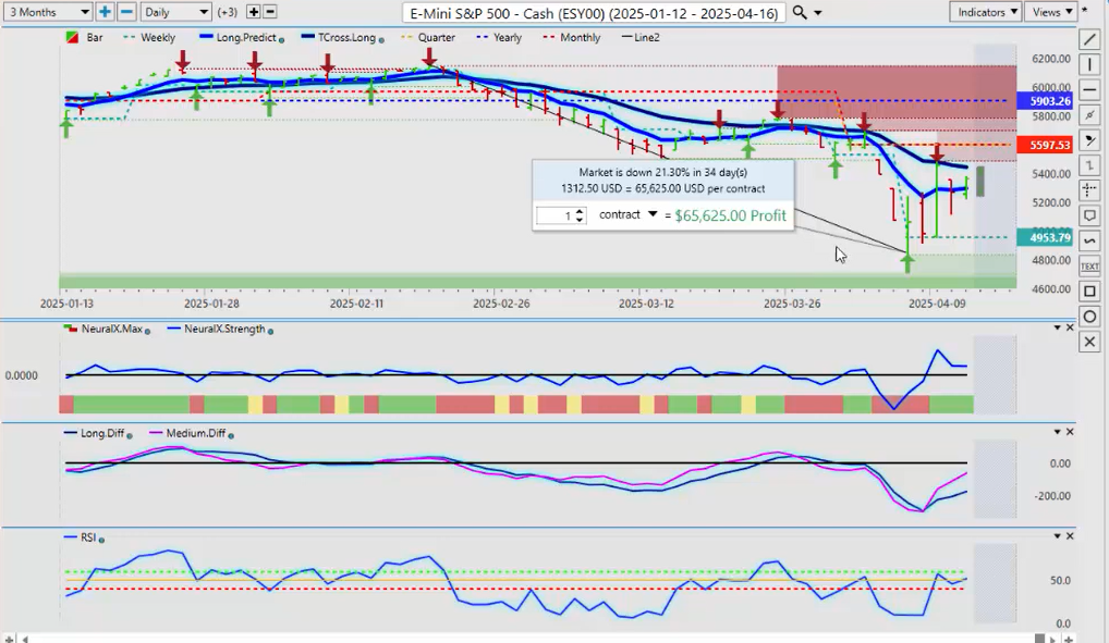 Now, the equity markets again, they’ve really been all over the place here. But the, again, the US equity markets are, in my respectful opinion, only the weaker of the group in most cases. The CAC 40, the DAX 30, the S&P, the Nikkei, uh, all the global indices are connected, but there’s been a disconnect as of late. The S&P 500 is firmly below its yearly opening price, and that’s going back to March the 3rd. So, right now, do we have a bottom in place for the S&P 500? I seriously doubt that, guys, because again, we’ve got tariffs one week, next week we don’t. There’s a lot of volatility in there, but for next week’s trading, the immediate low is 4835. So that is a main support level. You can see that we’re retracing back; we’ve closed above the Long Predicted. That’s positive, but we’ve got to get above the T Cross Long at 5443. That is your area to watch, along with 5597, the current monthly opening price.