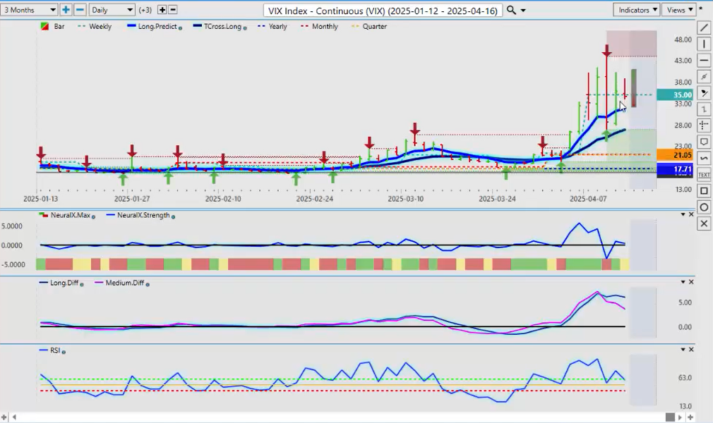 Now we should keep a very, very close eye on the VIX again, looking at all markets, not just one or two stocks or one or two Forex pairs, a broader market outlook, and we would need to bring the VIX into this. So the VIX right now, in the VP software, we can see that the pink line over the blue line is saying that the medium-term trend is weakening against the long-term uptrend on the VIX. We are still above our Long Predicted and our T Cross Long. Structurally, this looks very good, uh, but a retracement, first, probably back down into this area between 31.85 and 26.83, and then we would reassess at that area if we still have a possible buy here. So I’ll be watching these levels very, very closely, but it’s good to know where they are. The quarterly and monthly, 21.105, the calendar yearly opening price, 17.71, but I will point out that the VIX has largely been positive the entire calendar year, as you can see. And then the most recent volatility has really caused a couple of big spikes, uh, so we’ll watch it closely, but I believe that, um, the VIX is not done to the upside, uh, just quite yet.