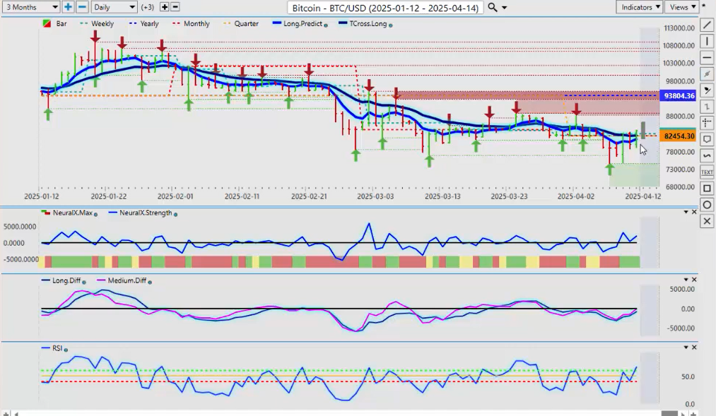 Now with Bitcoin, Bitcoin, uh, again, responding to a lot of the things happening in the equity markets in the global commodity markets. Now we’ve recovered; it is looking pretty good here, uh, we’ve just got to get above 82,466 and stay above this level in order to take the pressure off the immediate downside. We’ve got good verified support, uh, at 74,496. That’d be an awesome buying opportunity. Hopefully, we’re lucky enough to get down there again next week. But once again, look where you are midday on Monday, and then on Tuesday or Monday evening, start hitting the markets based around whatever announcement, whatever they’re going to hit us with here, guys. They’re going to hit us on Monday. Okay, so at the end of Monday, we can look and see what we’re dealing with for the rest of the week, but the VP indicators are saying that Bitcoin is going higher, so that may not be on Monday, but I suspect it will be on Tuesday, Wednesday, and Thursday.