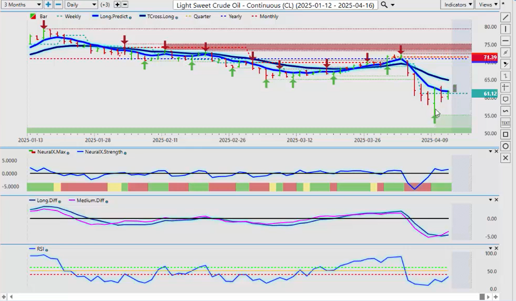Now with oil prices again, taking a beating this past week, uh, we have a good support low now, and that’s coming in around $55 a barrel. Good buying opportunity, but again, with this being an outlook, not a recap of something that’s already happened, excuse me, we’ve got a trade potentially in progress here about to happen next week. That MA Diff Cross is a zero-lag indicator; it measures the strength of the medium-term trend against the long-term trend, so it’s looking at two different things at the same time, and that some of the people have affectionately referred to this as the death cross. So if you’re short on oil, you might want to exit that short because the probability of going higher based on these VP indicators is very high. We just have to cross our Long Predicted at 61.72, and that will open the door to 64.94 and potentially higher as we get closer to that known seasonal period in May and June on the oil contracts.