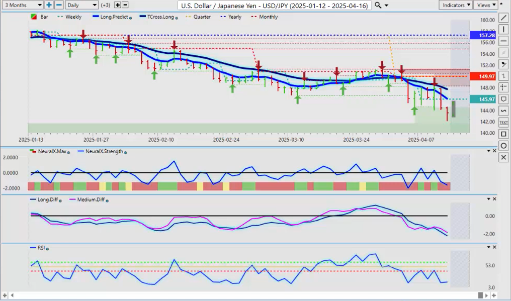 Now, the Dollar Yen, once again, the Dollar Yen is going to be fully susceptible to these tariffs, but beside, uh, away from the tariffs and everything else, I will point out that I’ve been, uh, especially on the, on the VP Weekly Outlook, uh, I’ve been very, very pro-Japan on this actually, that, uh, this pair has been grossly overextended for a very long period of time, all to do with a very confused Fed. He’s cutting, he’s hiking, he’s cutting, co, uh, but when the equity markets slide, the yen and the Swiss Franc strengthen, in most cases, so does the US Dollar, but they’ve fallen out of the world is now questioning if the US Dollar will remain the reserve currency. That’s a whole separate presentation, guys, but for now, uh, structurally, this pair is very weak. Yearly opening price, 157.28, new quarterly opening, and new monthly opening. I cannot stress enough how important those numbers are, 149.97, uh, short while below this particular level. Our Long Predicted and our T Cross Long, 146.2 and 147.73, those are immediate sell zones for us, and the very minimum stop should be above 149.997 because we don’t want to get prematurely stopped out, uh, on what could be a very good short going into year-end.