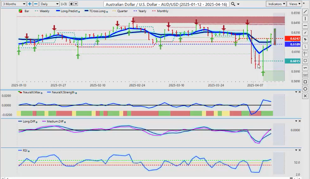 Now, the Aussie, you’re going to see something very similar. The Aussie has rebounded, uh, into the end of the week, but these four bars, right, daily bars right here, are very concerning. So understand what will trigger another sell-off in the Kiwi, the CAD, and particularly the Aussie, and that’s more China-US rhetoric on tariffs. I think if it, this heats up, it’s not going to be good for any of these three currencies, particularly the Aussie. So if, uh, things start to smooth out, we get a risk-on environment, then it will benefit the Aussie, but always understand that you’re trading under a guillotine here, guys, that if the, if Trump powers up on the tariffs with China, China retaliates, Aussie is caught in the middle here, so is technically, so is the Kiwi, and arguably so is the CAD. So again, we, our main level, 0.6189, our yearly opening price, uh, we’re so far so good here, uh, we’ve closed two days above our T Cross Long, so 0.6212, if you’re a buyer, that’s where it is, uh, but again, for the savvy trader, you can buy one, have a stop loss ready to go, and a sell limit order just below the yearly opening price, or the Long Predicted at 0.6177, either one of those areas, guys, because if it starts to crash, these bars tell you how fast that crash is going to be. So one could just sit on the sidelines, even for now, and say, “You know what, uh, if this is going to fail, I’m going to put my sell stop right below the calendar yearly opening price.” And I know that if it breaks that, uh, potentially, I’m going to run down two, 300 pips very, very quickly, and the same strategy would apply to the Kiwi, guys.