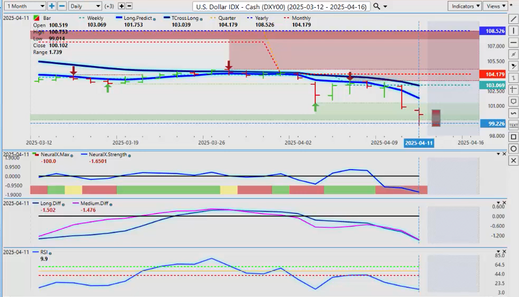 Okay, hello everyone and welcome back. My name is Greg Firman, and this is the Vantage Point AI Market Outlook for the week of April the 14th, 2025. Now, to get started this week, we’ll begin where we always do, with that very important US Dollar Index. Now, the dollar is under significant selling pressure, largely due to the confusion around the tariffs—they’re in one day, they’re out the next. But here’s where we’re at: when we’re dealing with this kind of volatility, we always want to make sure we’re going back far enough to ensure there isn’t, uh, some invisible support, if you will.