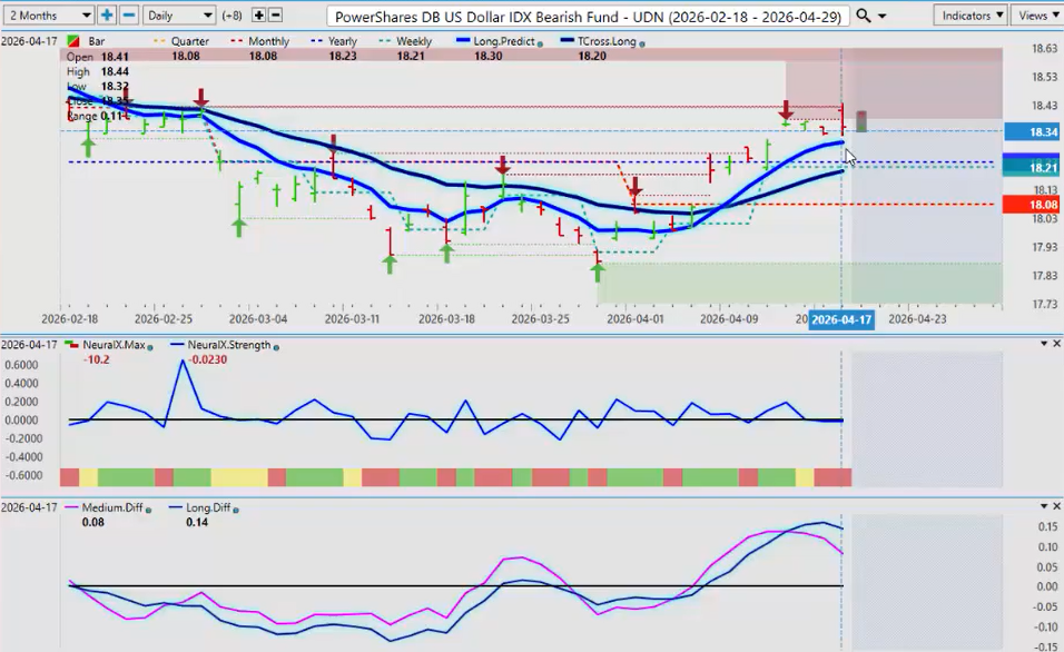 It too also has an MA diff cross to the upside with the neural index turning green. So again what the anomaly that I’m seeing in over the last week or two is the dollar bear fund is also above its yearly opening price. This is a new one. I haven’t seen this one before not or at least not in a very very long time because one is a bear fund one is a bull fund. They can’t both be positive here guys.