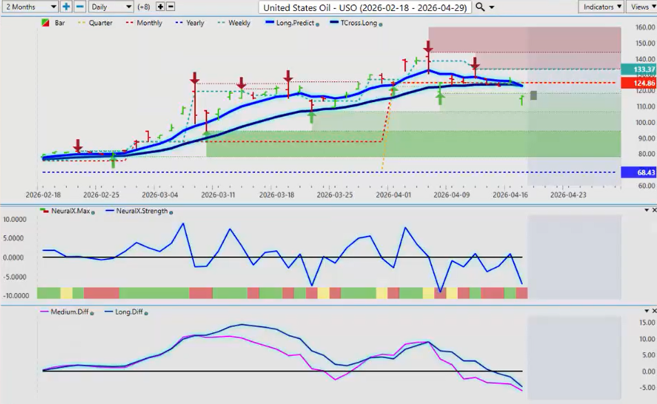 Now, the Kiwi could enjoy some of that strength too if the bank, a very confused bank of New Zealand decides to hike. So that’s what the market believes. But right now your quarterly and your yearly opening both sitting down here 5746 5753. But the first move that we are likely going to gravitate towards would be the TCross long at 5839. That’s the immediate area you want to keep your eye on. But again an MA diff cross to the downside on the Kiwi. And then we have again an MA diff cross on the Aussie to the downside. And when you look at the CAD, these three highly correlated currencies with Canadian dollar being the weakest, that one and not the base currency. It’s the quote currency. So the MA diff crossed to the upside. All three of these currencies are likely to lose momentum unless we get some miraculous settlement on Monday or Tuesday, which I think at this particular time is highly unlikely. But with all these events, there will always be opportunity using the VP software. So, with that said, this is the VantagePoint AI market outlook for the week of April the 20th, 2026.