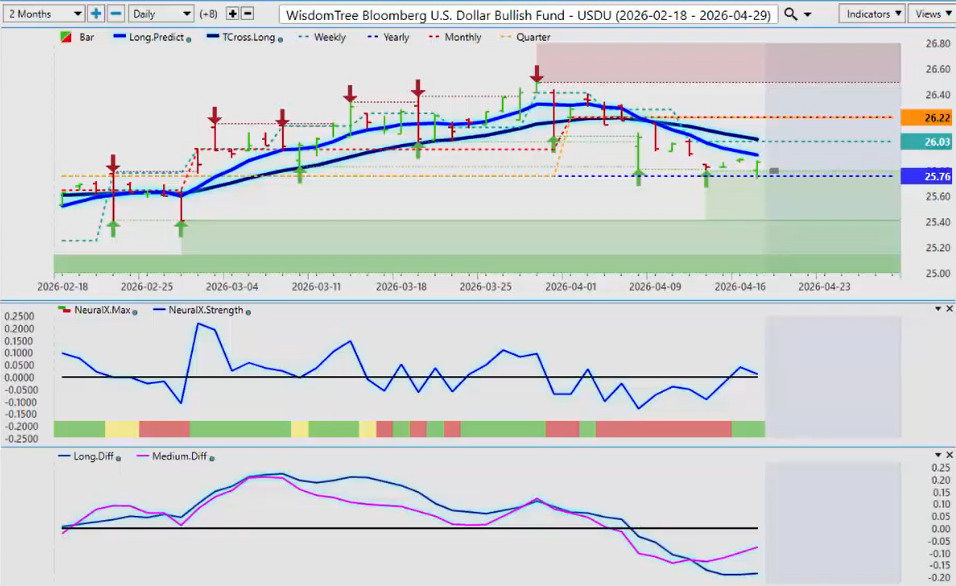 Now, to get started this week, we’ll begin where we always do with that very important US dollar index. Now, bit of an anomaly this week. We’re going to look at a broader look at the US dollar via the ETFs and on the futures side. So, the USDU, we’re sitting just above the yearly opening price. We have an MA diff cross and again this is pointing towards some type of dollar strength. Now the straight of Hormuz my understanding is it’s closed again. Tensions are escalating. So that does support fundamentally for the dollar to move higher. Now when I look at the UUP which is the dollar bull fund, it too remains above the yearly opening price.