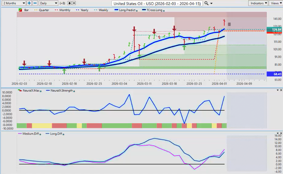 Now, with oil prices, I think that oil prices are about to explode to the upside potentially again next week. A lot of rhetoric over the weekend between between Trump and Iran. So, I believe a threat has been laid that that Strait of Hormuz must be opened immediately. Hopefully, I said that word right. Sorry. But again, a very choppy volatile start on Monday because Iran does not appear to be backing down. So, we’ll see how this one plays out or if if there’s some kind of settlement. But right now, we have an MM diff cross that is back to the upside. We’re firmly above the quarterly opening price.