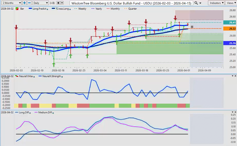 The neural index strength pointing straight down. We do have a medium-term crossover to the upside, but guys, this is a great example of this. When you have a a medium-term crossover and it’s below the T cross long and it’s below the yearly opening price, the primary trend is still down. So again, this could be just a corrective move back up in an overall downtrend. That’s the way it currently looks. Okay?