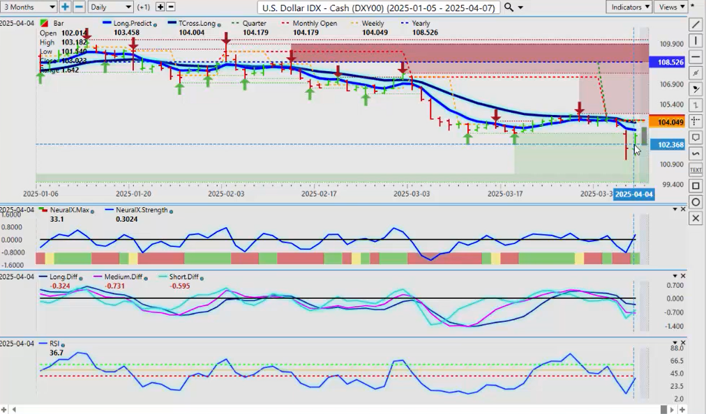 Okay, hello everyone, and welcome back. My name is Greg Firman, and this is the Vantage Point AI Market Outlook for the week of April 7th, 2025. Now, to get started this week, we’ll begin where we always do with that very important US Dollar Index. Now, no shortage of volatility this past week, that is likely going to continue into next week. Now, the dollar selling off on the tariffs but quickly recovering on Friday after the non-farm payroll number and after the Fed comments about inflation and potentially looking at keeping rates where they are or increasing rates. So, that supported the dollar indirectly and caused a significant sell-off in Gold. Now, that’s the fundamental side of this, but when we look at the dollar, we’re negative on the quarter, we’re negative on the month, the quarterly opening price 10417. I do anticipate the dollar can retake this level. If we look at the Dollar Index, not just with what’s with the Euro, the British Pound, the Yen, the Canadian Dollar, but if we look at the Aussie and the New Zealand, they’re getting absolutely pummeled by this tariff news with China and the US. So again, the dollar holding its ground, coming out of the gate here. Reverse check mark on the predicted RSI suggesting we’re going to recover if nothing else back to our TCROSS long at the 104 level. Now again, this is all news-driven, these prices in the equity markets, the commodity, particularly the currencies, all of this, even Oil being affected by the tariff war. So right now, that T cross long, we need to break through this particular level if the dollar can hold its ground.