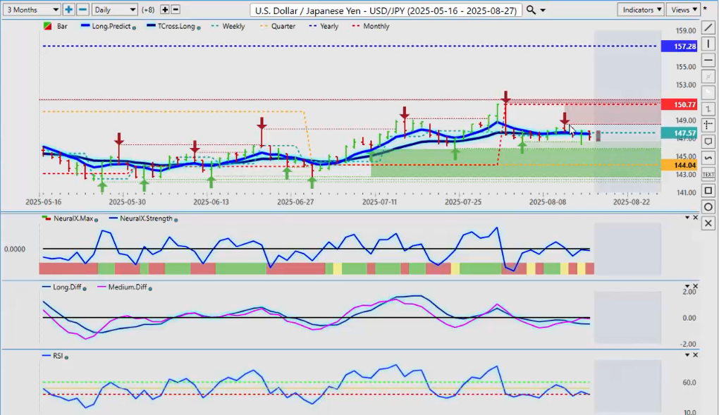 But for now, it’s still a loose buy signal here in VVP. Their core indicators, their trending indicators, and their contrarian indicators are suggesting that there’s more upside potential here than downside. But I would argue, respectfully again, that we are between the monthly opening price at 150.77 and the quarterly opening at 144.04. That is a true range to deal with here, guys. That’s where we’ve been basically the entire month—trapped between these two levels. And right now, we are almost right on the 50% mark of this particular range.
