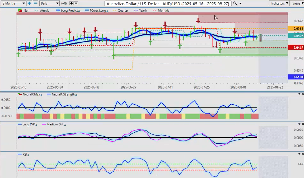 So, the Tcross long—very important level for us—0.6513. We’re struggling all along here. We pushed towards the quarterly opening last week and failed every time. So again, I think that we will be looking at a break of that and then moving back into our verified support low at around 0.6419. And assuming we get to that by next weekend, I will reassess next weekend whether longs could be reasonable at that level or not.