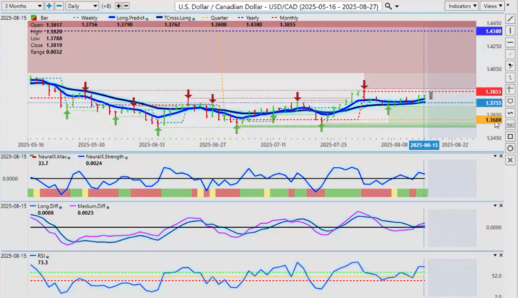 The pink line, which is the medium-term trend against the long-term trend, has crossed over on Friday, suggesting that we are going to at least test this 1.3850 area. But if that breaks, then 1.4380. I’m confident we’re not going to hit 1.4380 in August, but we could start moving towards that in September. So, this could be the breakout play that we’re looking for on the long side right now.