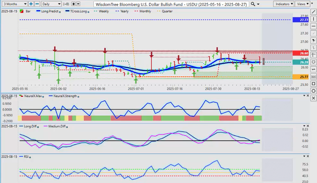 Now, to get started this week, we’re going to do things a little bit differently yet again here leveraging the new Vantage Point ETFs for the Forex market along with other markets that are correlated to the dollar. So, what we’ll look at here first is the UDN—uh, or excuse me, the UUP, the dollar bull fund—and we’re going to directly put it up against the USDU.
