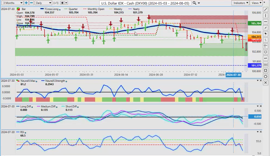 Now, to start this week, we’ll begin with that very important US Dollar Index. As we can see, this previous week we’re running right along the T-cross long, which I had discussed in last week’s Weekly Outlook. We do not look solely at the neural index for a trend. We use our T-cross long with the neural index, with the neural index strength, the predicted differences—there are multiple points of confirmation of a trend. But that’s not determined by the neural index. That’s not a highbrow thing—whatever that meant—that’s too funny, uh, but again, looking at these points of confirmation, these weekly videos are intended to help the average trader utilize the software potentially in a different way, identifying the primary trend and what the short, medium, and long-term trends are. We use that for the predicted differences. So, when we look at the Dollar Index, we can see that we could not get above our T-cross long on Friday. We had a substantial sell-off on the dollar, now that was largely based again on the non-farm payroll number. It was a very, very poor labor report, but my argument would be that that labor report has not been good for months, but the U6 now has had a significant spike from 7.4 to 7.8, plus the unemployment rate went higher. That is now going to likely force the Fed’s hand to cut, but uh, it’s not about one cut, guys, it’s about how many we get into the year-end, and how it will affect the dollar. Now, another point of confirmation in the overall primary trend is the current yearly opening price. We don’t want to look at a rolling performance model, looking at the last random 5 days, the last random 30 days, we need points to do that in the current quarterly opening, the current monthly opening, and the current 2024 yearly opening. So the dollar remains positive on the year while above 101.37, and again, in most cases, there is still dollar strength in the fiscal in the US fiscal fourth quarter, which ends October 1st. So I don’t think the dollar is down and out here completely. I think the market has to digest that labor report, but the immediate pressure currently on the dollar is to the downside. We have three crossover short-term, medium-term, and long-term crossover momentum on the predicted RSI. This will affect all of your forex pairs, guys—Euro/US, Great Britain/US, US/Swiss Franc, US/Japan could be a big one, uh, and of course, AUD/US and New Zealand/US. So, a simplified version of this outlook is that we would either be buying or selling US dollars if the dollar is moving lower—in most cases, your other markets would be moving higher—uh, Gold, Bitcoin, potentially the equity markets, but they have taken a hit because now the market believes the US is going to potentially go into a recession.