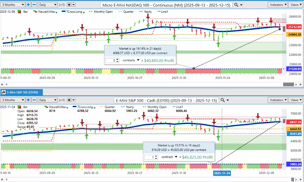 Now, if I look at the DAX, the DAX has had a phenomenal year. Another good run-up this past week, and then it pulled back when the S&P 500 did on Friday. But our TROSS long there is coming in at 23,967. Now, 98% of the time going forward, I will show the global DAX. Uh, this is year end, so I wanted to go right to the future side of this just to look at the comparative side of this.