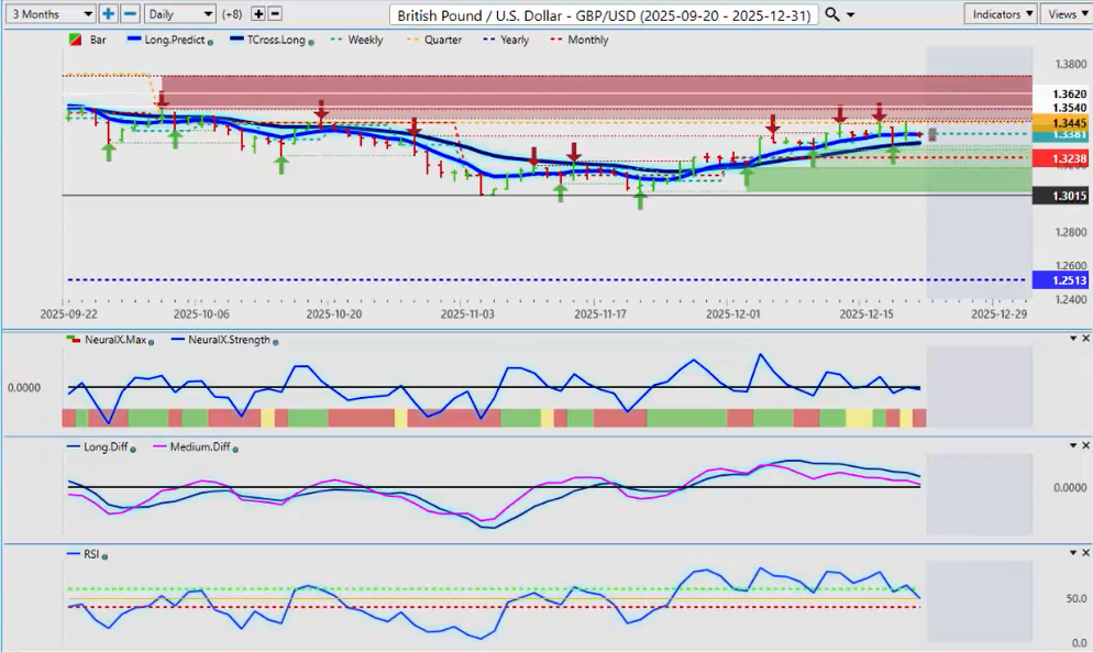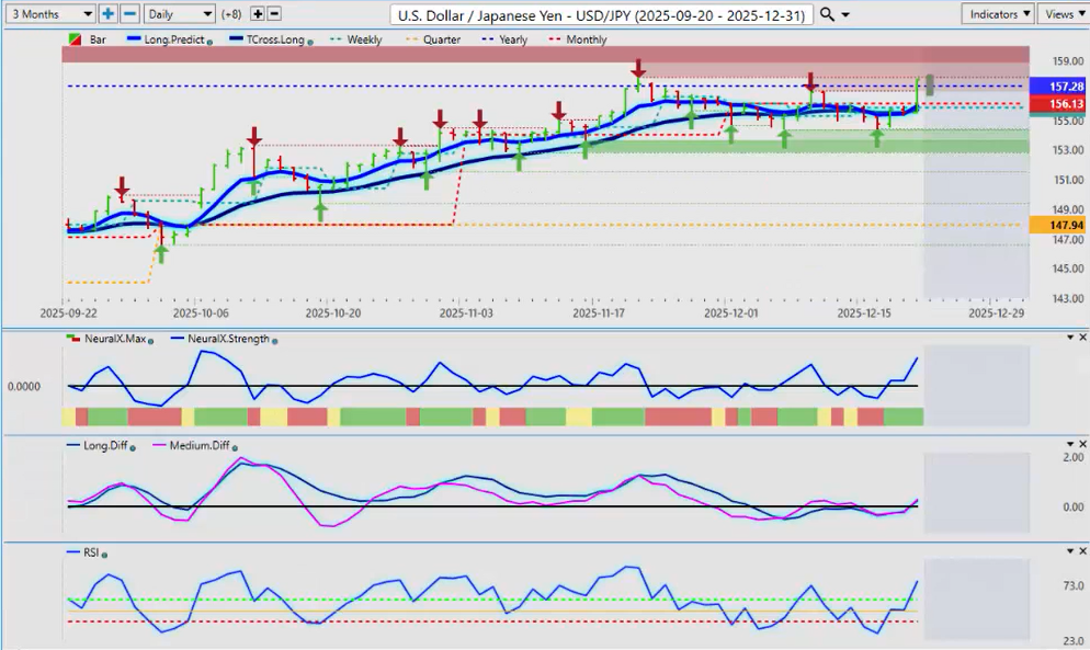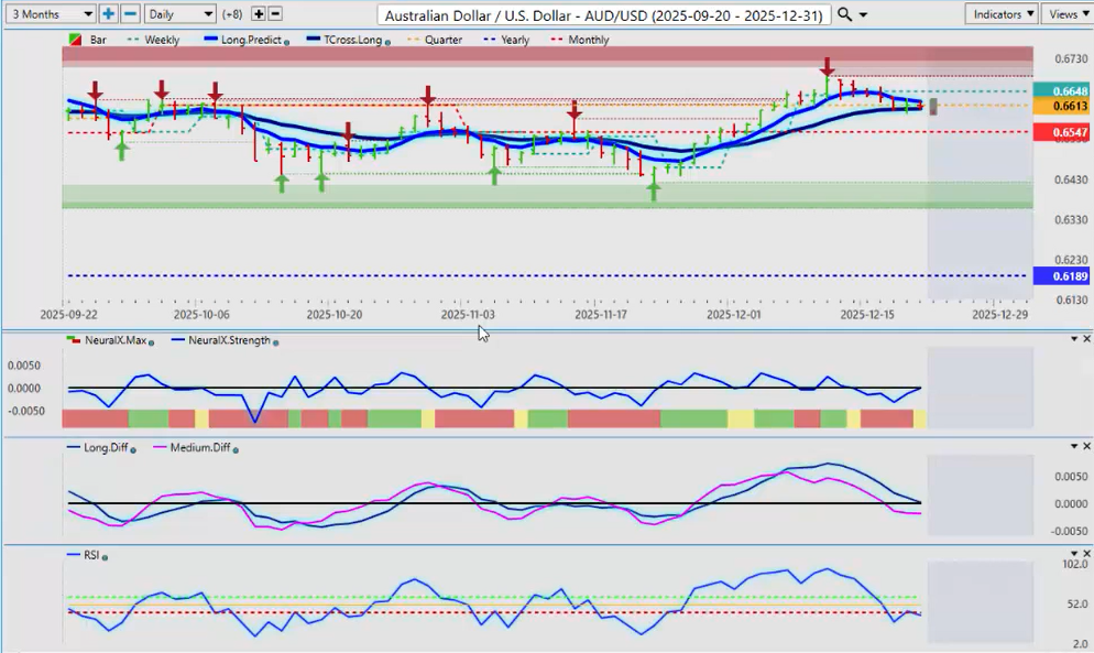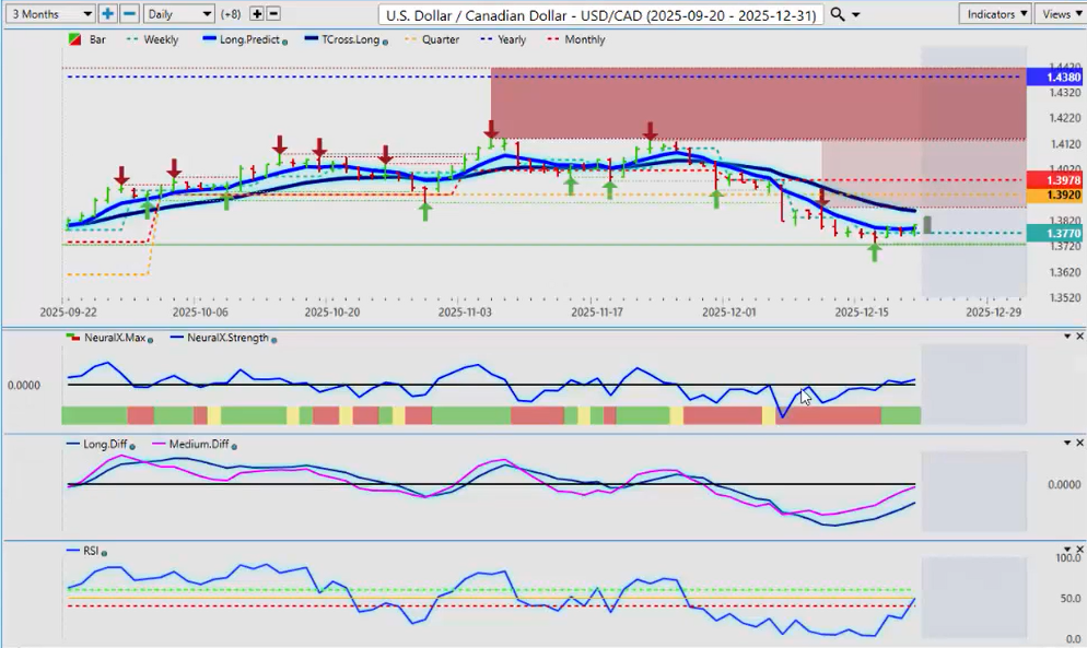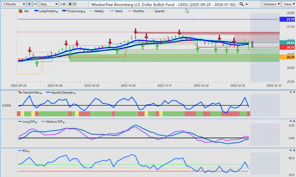 Neural Index is pointing down, but we have a medium-term crossover to the upside, but a little bit concerning on the predicted RSI that we’re pointing straight down. But in most cases, the US dollar doesn’t do overly well, uh, into about mid January, and then it starts to turn around. Uh, but for now, there is still, uh, we’re still negative on the calendar year but re remain positive on the quarter.