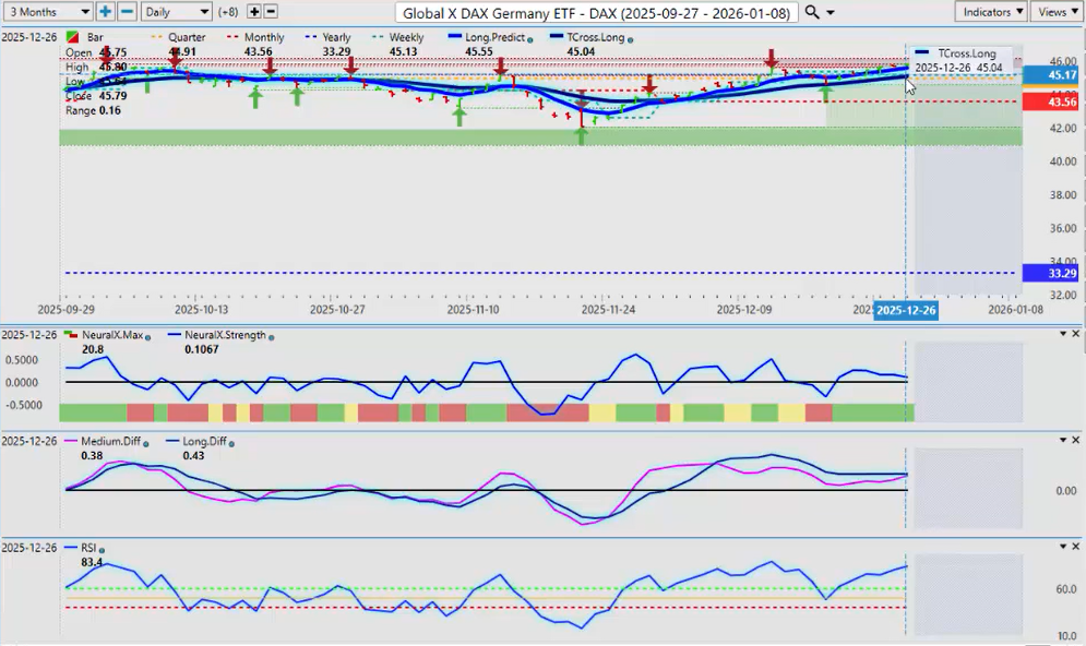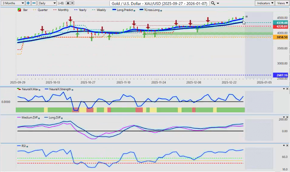 Now, when we look at Gold going into the final stages of 2025, gold always does very well in the month of December. But silver is actually outperforming gold here. Both are still looking pretty good. My concern here is we’re going to get into some profit-taking for some of the trading for next week, but really our focus does shift to 2026 as we leave 2025 behind. But a very, very strong year for gold for the final week of trading of 2025. Keep an eye on your TCross long at 43.60. I believe we will retrace back down to this particular level, and gold is likely to struggle a little bit after this very significant rally.
