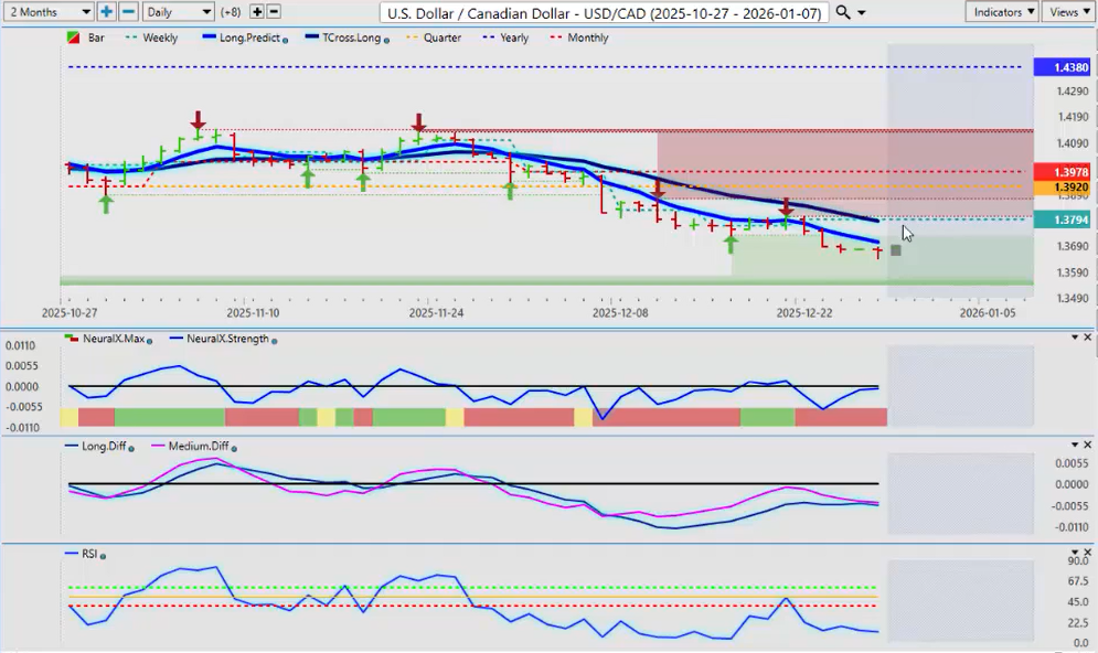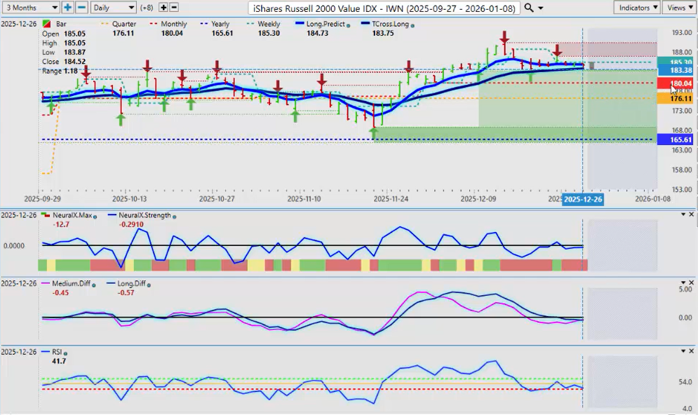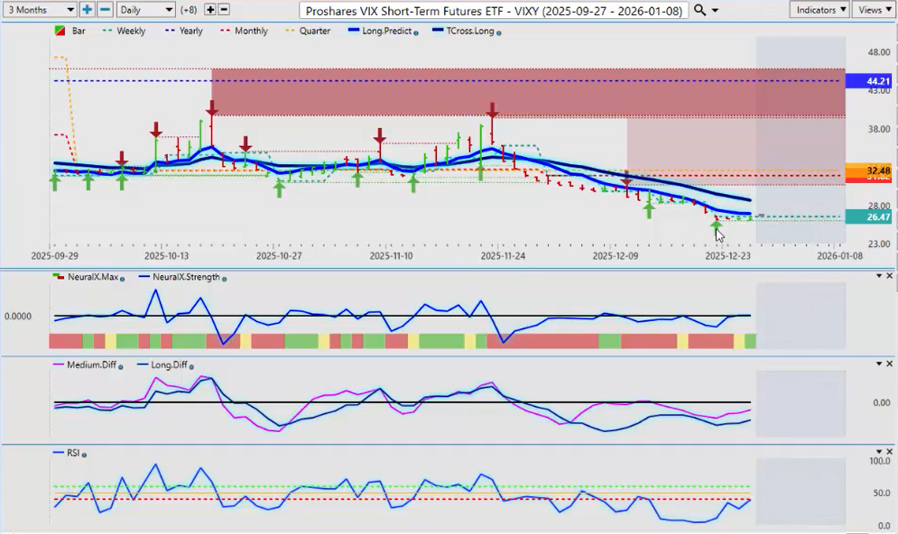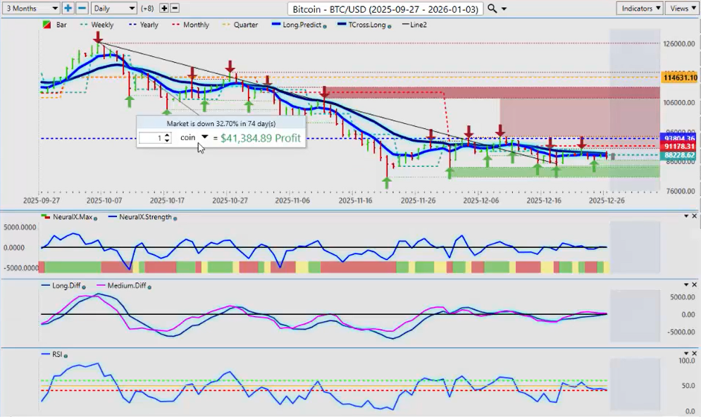 Now, when we look at Bitcoin finishing out the year here, we’ve had a significant move down from October to present day. And, in my respectful opinion only, this is the move I would have been looking for in 2026, not 2025. So, again, we’ll see how this one plays out. But right now the signal is actually somewhat bullish on the VP side. We’re below the TCross long, but we just don’t have any sellers below these most recent lows around 83,980. The lowest point we’ve got here is 80,742, which is consistent with December seasonal patterns. But again, right now, for this coming week, the TCross long is the one to keep your eye on—88,648. Can we get back up above that? That is the area you want to watch very, very closely the entire week right into Friday of next week. So, again, the question is, can we get above that? The VP indicators are medium-term crossover, long-term crossover. They look like they are trying to move to the upside, and the predicted RSI is showing no downward momentum at the current time. So, again, we could see some bullishness coming out of Bitcoin going into the latter part of the week.