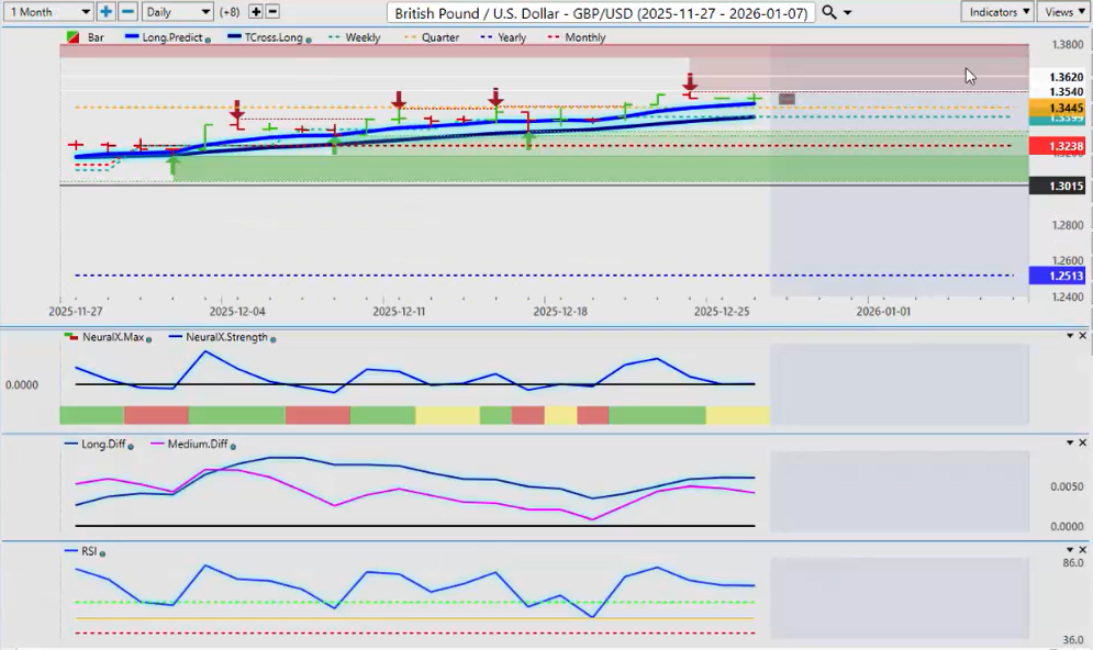 Now, the GBP/USD for next week—we can see that we’re structurally, again, it looks very good. Positive on the year, the month, the quarter, and the week.