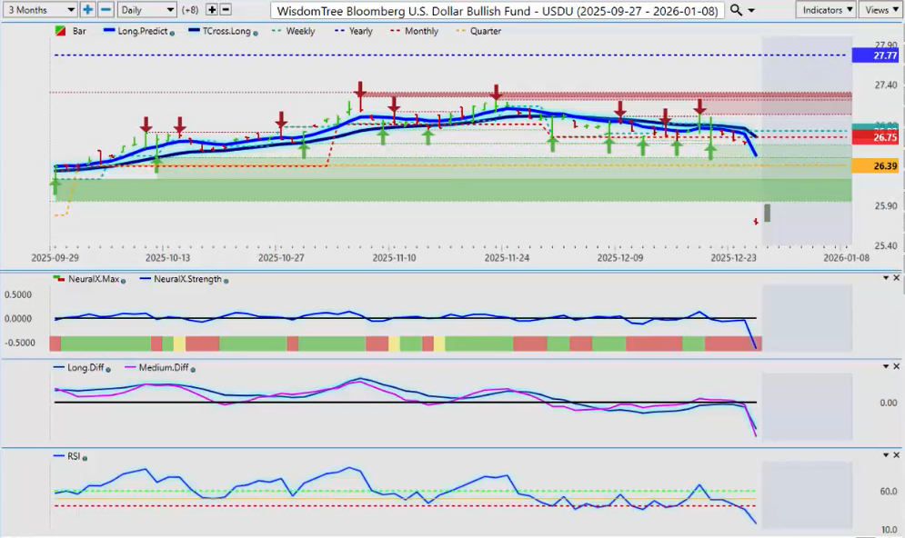 First thing we’ll look at is the U.S. dollar itself with the USDU ETF. Now, this one’s very interesting. The dollar coming under, again, significant selling pressure here as we round out the year, negative on the quarter. So, when we look back at this right now, my concern going into the final week of trading is a significant gap in downward price. Usually, that tells me that a move is coming to an end very soon. When I look at the bull fund, the same thing: we’re holding below the previous week’s weekly opening. So, again, some signs of dollar strength here. The data coming out of the U.S. is very, very strong—the CPI coming lower, GDP blowout number, I believe it was over 4%. So, again, the media continues to push the narrative that the Fed has to cut, when in actual fact I really don’t think that’s the way this is going to go in 2026, but we’ll see how it plays out. But for now, there’s a very significant gap between where the market is closed and our TCross long. That’s all the way up at 27.68. So, not exactly super bearish here—uh, a retracement, if nothing else, to the mean. The mean revision between the TCross long and the long predicted seems imminent at this particular time.