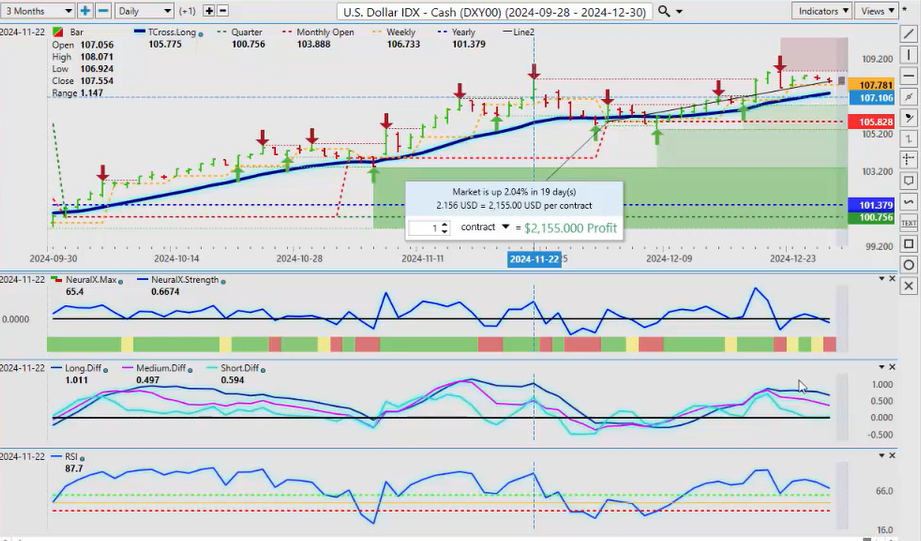 Now, what we can assess is that we have a clear Buy Signal on the DAX, the pink line over the blue line. This is suggesting the DAX is going to have an up week next week. I would like to see us get above the T cross long at 19,999, but again our neural index strength is perfectly positioned with the neural index, the MA diff cross, and the predicted RSI. If it gets above again, above the 60 area, then we’ll have momentum building. So going into the year end, the DAX looks a little bit the European equities look a little bit better than the North American equities, but I believe they both can rally at the same time.