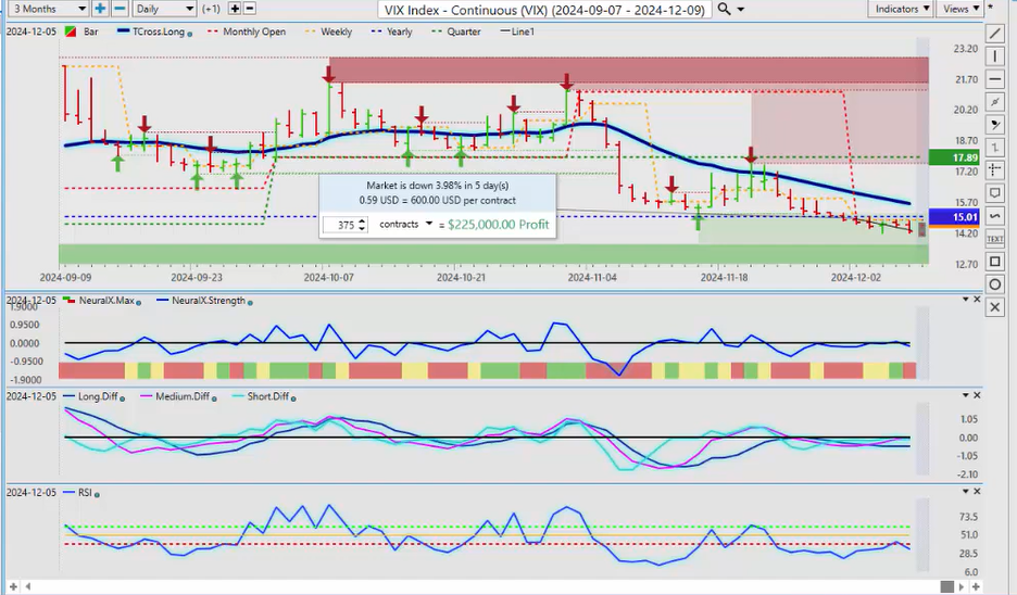 So gold struggling a little bit up here, but I believe if we can get above our T-cross long at 2644, that that should push gold higher with the CPI number probably becoming a little softer, uh, triggering more rate cuts that should help our gold contracts. But again, we must get above 2644. Our MA diff cross is running sideways; you’ll notice the predicted RSI running along the 40 level. Now, the 60-40 split in the predicted RSI, I’m only looking for momentum from the RS predicted RSI, nothing more, not overbought, not oversold, do I have momentum building to the downside by the indicator? No, I do not. So again, if we can get back up above the T-cross long, get the neural index turning positive, then gold should move higher into the end of the month and into January.