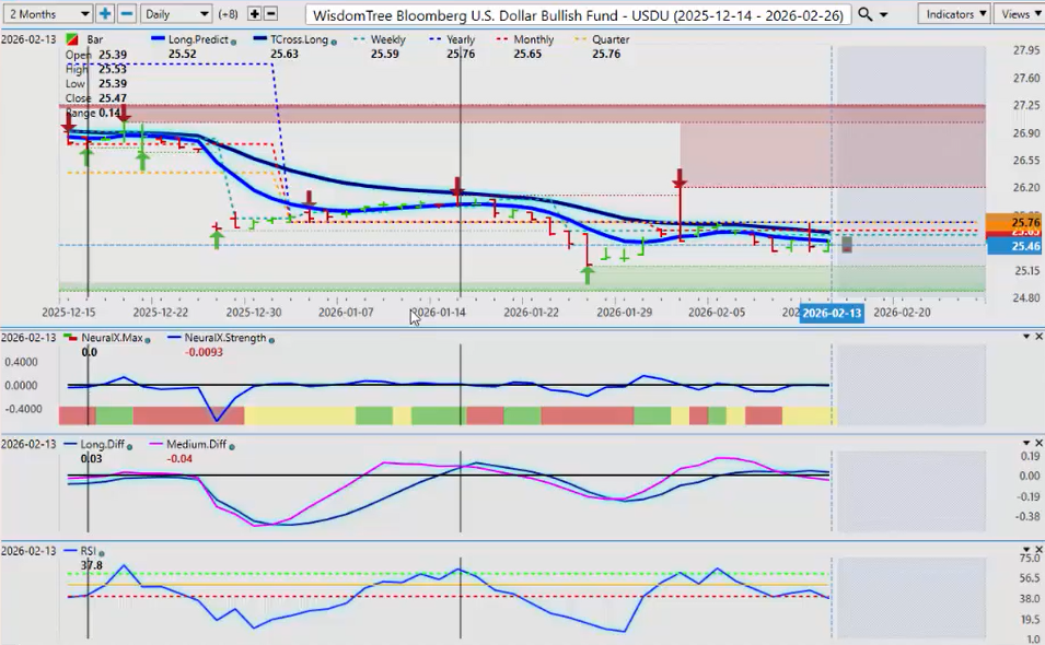 Now, to get started this week, we’ll begin where we always do with that very important US Dollar Index. Now, what I’m using here through the VP software on the ETF side is the WisdomTree Bloomberg U.S. Dollar Bullish Fund (USDU). I found this to be incredibly accurate in its predictions, with less weighting towards the euro currency. So the first thing we want to look at is repetitive patterns in these markets. I’ve discussed this on here for literally years, guys, that there’s as clear a pattern as I can see with the US Dollar Index being strong at the end of the month into the first week of the new month and usually seeing significant weakness around mid-month. So right now, if I look at December of 2025, you can see that we were below the yearly opening price. We were struggling along the monthly opening price. Then between the 15th and the 18th, the dollar sold off. We then come into January, what appears to be a very bullish move coming out of the gate into January, and then you can see we hit the exact same period of time around the middle of the month and, mysteriously, with a very bullish signal up to that point, the dollar fails again. Then it turns around at the end of the month, comes back up again. So where we’re at right now is we’re basically the same as where we were last year. We’re struggling along the yearly opening price, the TROSS long, monthly opening price. Everything is sitting right there, guys, and we’re going into a period of known U.S. dollar weakness. So that doesn’t mean that every single month this would occur, but it does usually occur 10 of the 12 months per year. So again, nothing is 100% in trading or investing, but these types of repetitive patterns—always remember that currencies are not like stocks or futures or options. Nobody has to buy any of those, but via currencies, people are required to buy and sell them, particularly at certain times of the month. So for next week, we have our yearly opening price, which will come in at 25.76, and then our T-cross long and our monthly opening price are basically at the exact same level. When we connect the dots to these monthly patterns, there’s a high probability of dollar weakness coming next week. Now we do have the PCE data next week, but again, a holiday-short week. So you’re going to see volatility on Tuesday, but by Wednesday and Thursday, the price should start to smooth out with dollar weakness. Right now, we have the pink line crossing the zero line. This is the proper structure of a medium-term crossover in the VP software. We’ve crossed the zero line. The pink line is a medium-term crossover. It is telling us that’s occurred, but we are below the TCROSS long when this has happened. We are below the monthly opening. We are below the yearly opening. That is the proper way to use the medium-term crossover here, guys, not randomly by itself, because very often the medium-term crossover can be corrective in nature, not necessarily part of the primary trend. So in this particular scenario, the medium-term crossover is consistent with the primary trend to the downside.