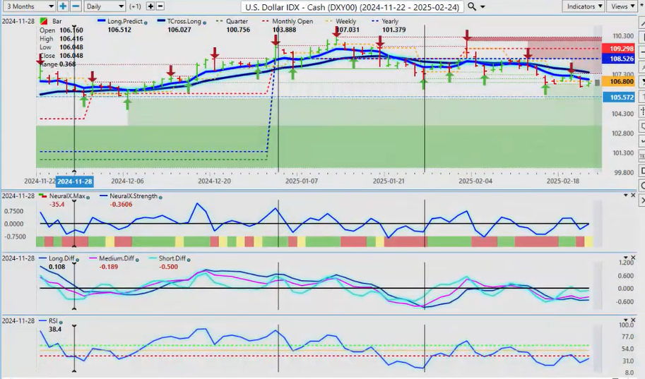 Okay, hello everyone, and welcome back. My name is Greg Firman, and this is the Vantage Point AI Market Outlook for the week of February the 24th, 2025. Now, to get started this week, we’ll begin where we always do, with the US dollar Index. Now, what I’ll do a little bit differently this week is show you guys patterns that usually occur every single month, around the same time, give or take a few days, but a period of dollar buying at the end of the month into the first week of the new month, till the week after the Tuesday after the non-farm payroll number. So, what I’ve done is highlight some of the current indicators through the chart over a 9-month period, so we can see over this 9-month period that there’s always something funny going on.