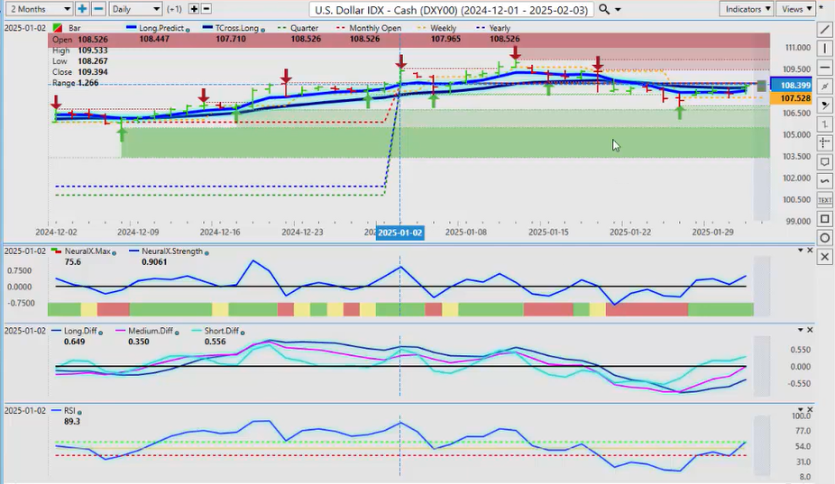 The US Dollar is usually strong at the end of the month into the first week of the new month until the Tuesday after the non-farm payroll number. I don’t see that anything has changed here starting in 2025, so 108.52 is the current yearly opening price. The VP indicators are bullish; we’re gaining momentum on the dollar but expect a very, very choppy start to the week. Monday trading has been very volatile; this Monday will probably be even worse now that the tariffs are in place. So be careful on Monday, and in fact, with my own direct client base, I usually warn them to just stay out of the market until at least noon on Monday. Get a sense of feel of which way this thing is going, and then start to hit the ground running Monday evening. So again, still a bullish tone to the dollar. Our MA diff cross needs to complete here; we have a short-term crossover, a medium-term crossover appears imminent, and again, we’re at 60.2 on the predicted RSI. That is warning that momentum on the dollar is actually building.