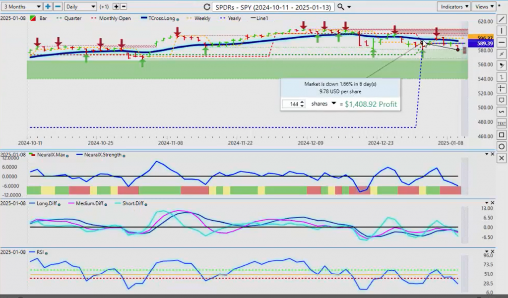 Now, again, when we look at the SPYs, same thing here, guys, we’re breaking down, but we don’t want to move our anchor points off of here to back into 2024, because that’s how most people create false signals. They’re looking back here and saying, ‘Well, it’s in a big downtrend.’ Well, yes and no. We’ve got to look at it from the current calendar year. Usually, in the first quarter, all markets will fight it out around the current yearly opening price to determine if something’s truly bullish or bearish. So we’ll keep an eye on that, but for now, there’s a slight bearish tone, but I do expect stocks to recover as early as Wednesday, but one of the rationale behind that, of course, is the VIX.