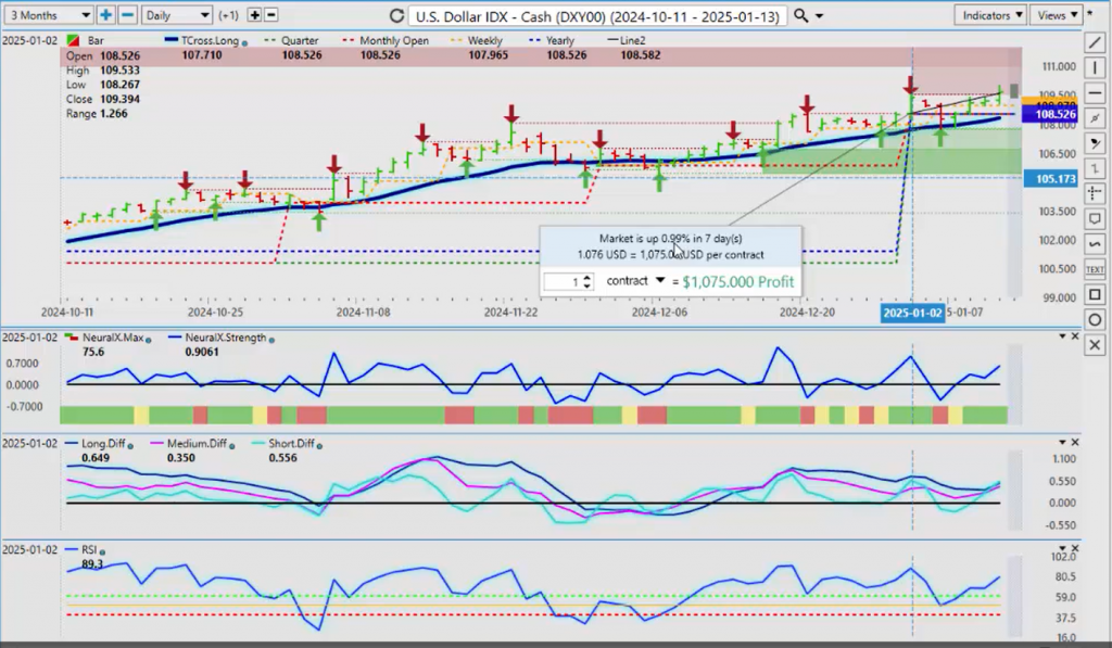 Now, one of the star performers also to begin the year is Light Sweet Crude Oil, up 6.49%. Again, we’re coming up into some very heavy resistance around the 80 level. I believe it should start to slow down once we hit the $80 barrel. We do have an MA diff cross on the downside, so we’ll be watching this one very, very closely, but it has made a very strong move from the beginning of the year. And as you can see, in 2024, it really struggled with that yearly opening price from 2024. So our retracement point will always be the monthly opening, the quarterly opening, and more importantly, the Tross long. So when we look at the Tross long in comparison to the current yearly opening price, there’s pretty heavy support there, guys. So if you’re looking to buy, I would respectfully submit that that’s probably your best bet. Now, you can also click on the F8 in our Vantage Point software, and we can use our long predicted, and you can see that the market’s been in good contact with that the entire week. That current level for your more aggressive traders looking to go long oil would be 74.37. So keep an eye on that area also, guys.