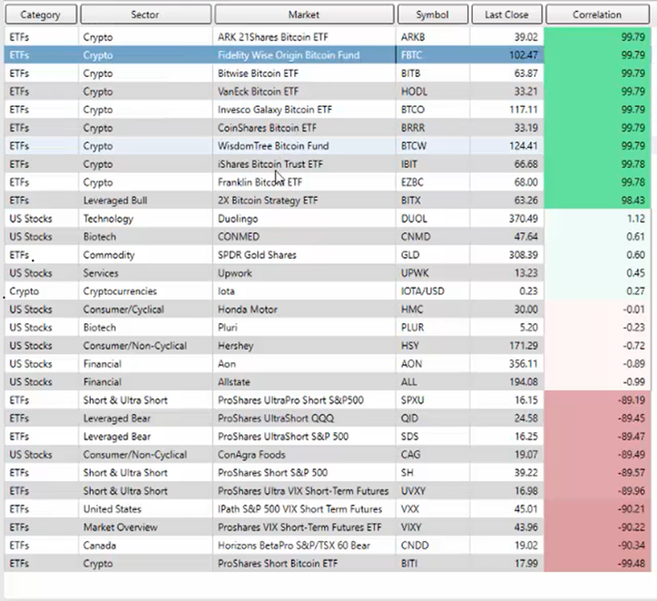 And if I look at the year-over-year correlation—and if Bitcoin is going to soften next week—then you have a number of different unrelated stocks here that could actually rise when Bitcoin moves lower. That’s starting at 88% inversely correlated all the way up to 97.73%—the ProShares Short Bitcoin.