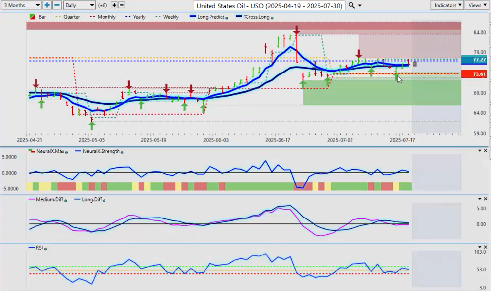 Now, US oil here going into next week’s been a little bit choppy. But once again, to validate to everybody the power of using simplicity with AI, like the quarterly, the yearly opening price—right now, US oil came down, touched the quarterly opening price and went right back up to where we are now. And now it’s challenging the calendar yearly opening price and that price is coming in at 76.84.