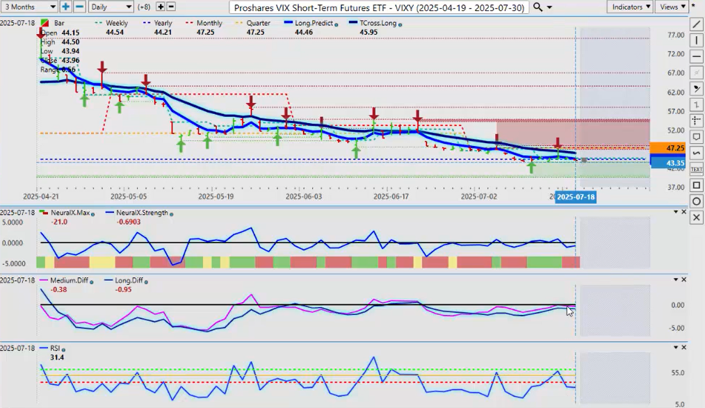 Now, looking at the ProShares on the VIX side of things, the VIX is sitting right on its calendar yearly opening price. We’re below our T-cross long. The predicted differences are trying to push forward, but it can’t. And again, with a breakdown below the 50 and the 40 level on the predicted RSI, that is warning us that more downside pressure is likely on the VIX. So that’s indirectly supporting the global indices. So we’ll keep that in mind. But for now, it’s very, very shaky.