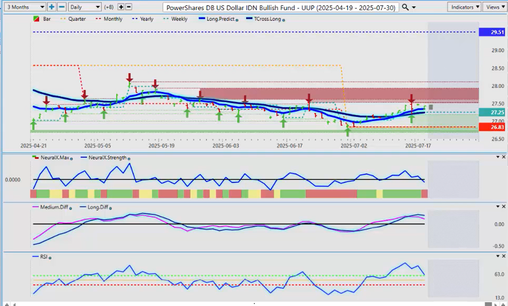 So, when we look at the indicators to start the week, the neural index is pointing down. We have an MAF cross, but our predicted RSI is above the 50, but it is weakening. So the way we would interpret this is that this is a corrective move unless we snap down below that T-cross long at 27.41.